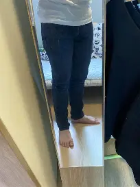 허리가 꽉 끼는 바지를 입고 거울 앞에서 고민하는 나